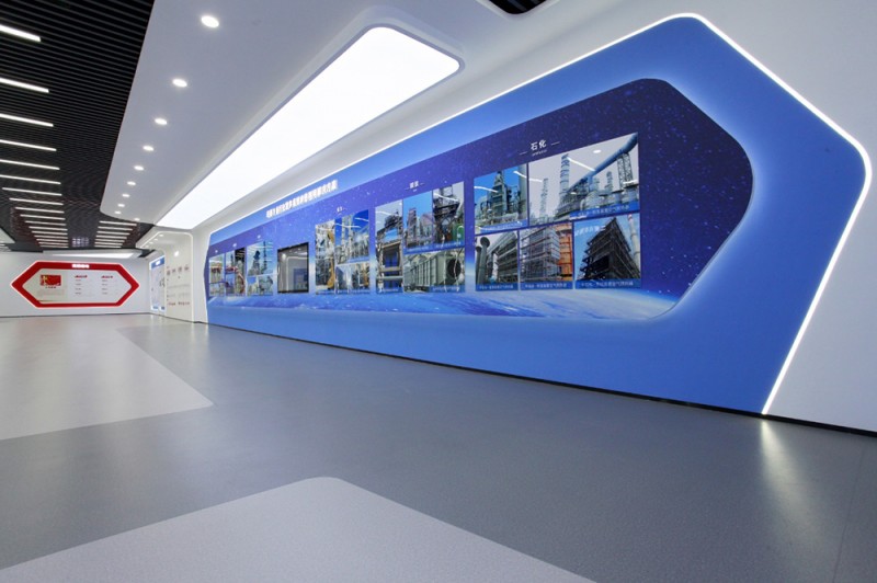 頂和地面造型統(tǒng)一,白色吊頂和灰色橡膠地面,黑色方鋼吊頂和灰色橡膠地面相互呼應(yīng),統(tǒng)一中富有變化,變化中又蘊(yùn)含統(tǒng)一,使整個(gè)展廳科技意境深遠(yuǎn)悠長(zhǎng)。