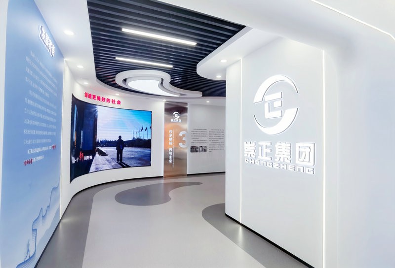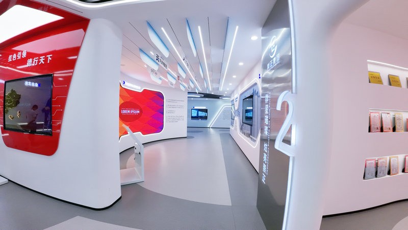 展廳中多處運(yùn)用電子互動(dòng)大屏放映企業(yè)專題片,并且將展廳墻體直角部分改為弧形,與曲面屏呼應(yīng)的同時(shí)增強(qiáng)了空間的整體流動(dòng)性。展廳運(yùn)用統(tǒng)一基礎(chǔ)標(biāo)準(zhǔn)色調(diào),使得整個(gè)展廳風(fēng)格更加統(tǒng)一。在頂部運(yùn)用線性燈與筒燈進(jìn)行融合照明,提升視覺美感。